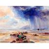 A beach scene, most probably a composite image, with a menacing sky just by implications of colours shows an impending storm, if not already but even that has its own beauty. Despite the apparent calm of the waters, the sampans are left idle on the right, as it may be dangerous to go out to sea. A cluster of rocks, off centre, in the foreground acts as a patterning element and to create an interest from the dull sandy beach with the distant mountains afar standing like guardians.