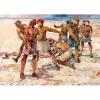 Khalil Ibrahim’s paintings of fishermen at work are both a heroic motto of self struggle and independence as well as the communal spirit. Here, the nine figures, with all the musculature to show strength and sturdiness, are unified in their poses of working on the nets on the beach. One figure, bending over in side profile at the centre, steadies the rhythm while the focus shifts to the right to a figure facing viewer with an unusual dash of white on the face. The sea-sky veneer is pushed all the way to the back.