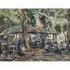 Kuo Juping, like Yong Mun Sen, was a “grassroot artist”. He was always there whether it be rubber estates, oil palm/cocoa plantations, padi fields, kampungs or the makeshift outdoor hawker centres, depicting the economic activities and pastimes of all the races. Here, you can see the genesis of the unique hawker culture paintings popularised by his protégé Tan Choon Ghee. Till today, Penangites dine alfresco round the clock. The remarkable thing is how Juping plays on the rounded shape in the hawker shelter canopy, the cemented rings around the trees and the tables, whilst the jutting triangle on bottom left is repeated in the chair and the semi-circle canopy. A well composed work.