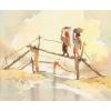 The two lone women figures, in tattered clothes, balancing a basket of unspecified produce on their heads on a rickety makeshift bridge exudes a rhythm of a precarious existence. The bleak landscape albeit rendered in somewhat bright hues could be that of a tin mine where new perils from the communist insurgency (Emergency, 1948) fol-lowed the upheaval of the Japanese Occupation (December 1941-September 1945). The 1948 period represented one of his high points when eight pieces of his works were exhibited in the Malayan Pavilion in the British Industries Fair in London, and he also held a solo exhibition called Malayan Scenes at the Victoria Memorial Hall in Singapore.