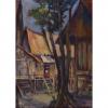 Kuo Juping was committed to painting despite having to run his father’s import-export business (Sin Guan Thye Company in Victoria Street, Penang). He never sold a single painting during his lifetime and signed his canvas only in Chinese, but someone later added a signature in English, probably to boost the value of the works. Sometimes, he would not sign and sometimes he would add a Chinese seal chop (Dr Tan Chee Khuan, Kuo Juping Memorial Exhibition, Penang State Art Gallery, August 5-30, 1997)In this painting, the three trees clustered together separate the atap-roof stilt houses, providing a shade and also indicating how tall the houses were. The direction of the three wooden ladders fanning upwards leads the eye in a play of slopes and triangles.