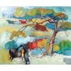 In Tew Nai Tong’s works, cow herders and cows often have a close affinity, blending with the natural landscape. The grazing ground is quite sparse with small clumps of green on the tree on the right. The branches whip back with a tentacle spreading to the left, suggesting movement.