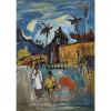 A clear delineation of the trinity of spaces, with the foreground being alive with humans and animal (the red cow), the middle ground firmed with the solidity of an unusually tall house with a wall cutting halfway into the picture plane, and the back expanse given to nature – sky and mountains, animated by the swaying palms of the coconut trees. The dark blue strokes swirling eastwards suggest the weather may change for the worse, but the male and female figures seem oblivious to the coming change of weather, while the cow bent on, grazing. Interestingly, the painting spots a sharp angularity in the mountains, the house (with Minangkabau-like roof), the cow and even the figures.