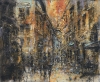Eston Tan has developed a unique stylised mode of expression in portraying landscapes. He incorporates lines of varying weight and strength, dots and drips of different intensity to create breathtaking views of night cityscapes. Illustrated here is a street scene bustling with figures walking or sitting outside a café. He swiftly outlines the Baroque and Gothic inspired façades of a city rich in history in charcoal over a yellowamber coated canvas. Dots of white, blue, green and yellow are applied sporadically to create a warm yet cool atmosphere, capturing a perfect European summer. A clock tower is seen in the background perhaps of the Rathaus building - as the title suggests - in Vienna, Austria. He has devoted a series of paintings capturing the night scene of Vienna in his solo exhibition titled 26°c in 2011.